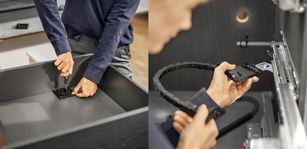 Vgradnja je izjemno preprosta in ne zahteva električnega znanja. Možna je celo naknadna nadgradnja obstoječega pohištva, kar odpira nove možnosti za vse mizarje in oblikovalce, ki želijo nadgraditi svoj portfelj izdelkov s premišljenimi rešitvami.